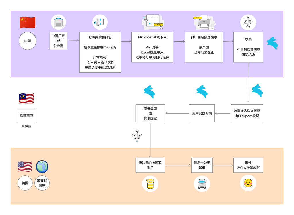通过Flickpost的转运服务,您的电商包裹从原产国发货,经马来西亚高效税务枢纽中转,并空运至目的国——确保快速送达、降低成本及优化税务节省。